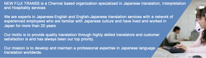 NewFujiTranss はインドで経験豊富な人達によって新しく構成された日本語の翻訳・通訳サービスです。その人達が20年にわたり日本で生活したり、仕事したり、日本の文化を楽しんでいて日本語の翻訳・通訳で豊富な経験を積んでいます。 新しい機械の設置にしても、電機システムにしても、自動車にしてもなんでも我々が専門にしていますので、信頼できます。 タミル言語の他、インドの主言語を話す南インドのチェンナイ市で熟練した質の高い技術翻訳者・通訳者を提供します。